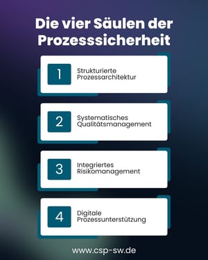 The successful implementation of process reliability is based on four central pillars: a structured process architecture, systematic quality management, integrated risk management and digital process support. These elements enable us to define clear responsibilities, standardize workflows and ensure the continuous monitoring and optimization of our processes.